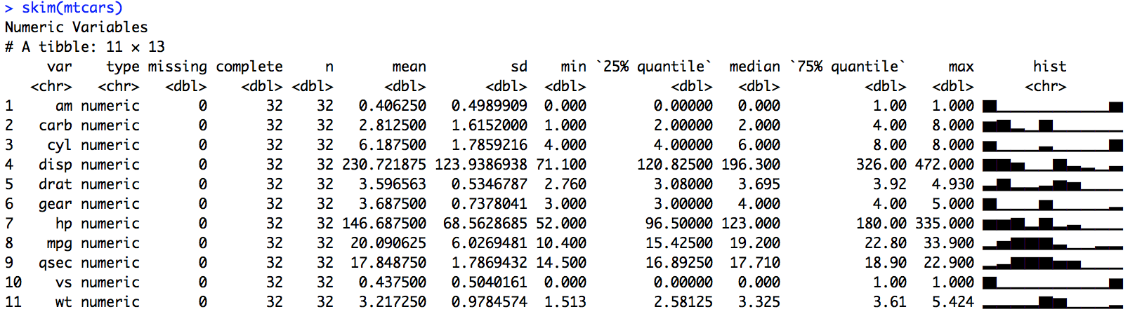 skimrSummary: skimr, a package inspired by Hadley Wickham’s precis package, aims to provide summary statistics iteratively and interactively as part of a pipeline. The package provides easily skimmable summary statistics to help you better understand your data and see what is missing.