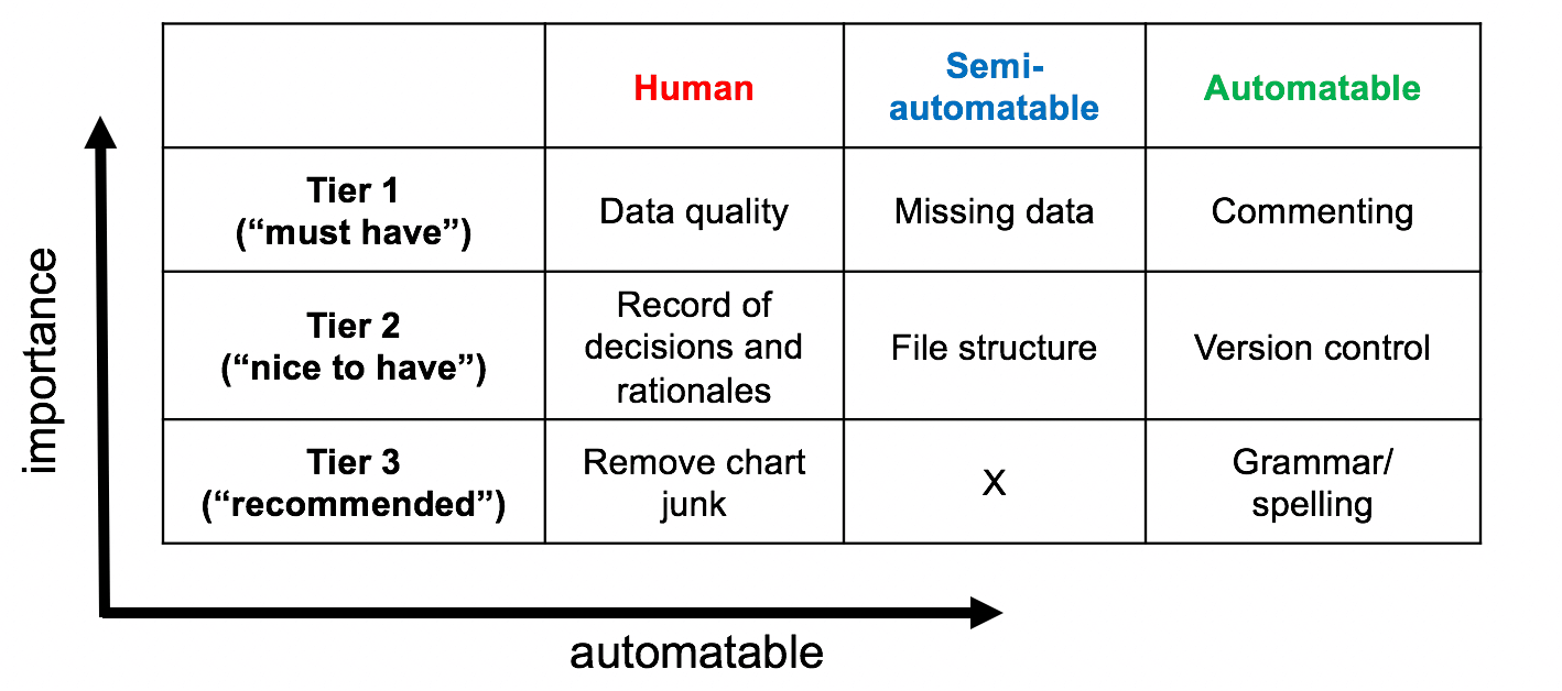 These review topics made their way into a Google doc which will form the basis of a review guide along the lines of rOpenSci’s package review guides. One major organizing dimension we hit upon was “Tiers” - as the number of best practices can be overwhelming, it is better to prioritize them so that users have a way of advancing through escalating levels of detail. Another was “automatability,” which is key to the other half of our work.