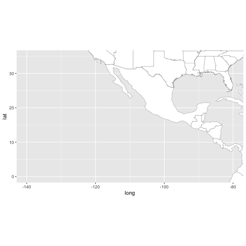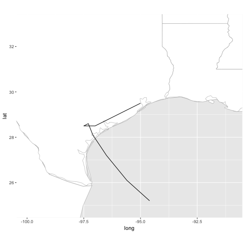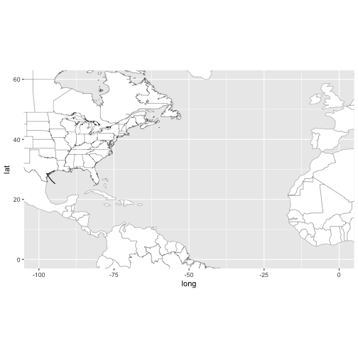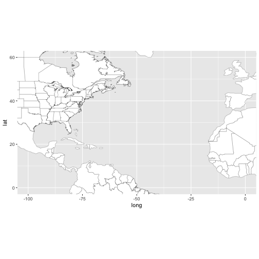 There aren’t many ways we can narrow this down other than using arbitrary longitude values. The observations in the dataset do not have a variable identifying which storm each set of values belongs to. So, I’ll remove the coord_equal call so we’re only focused on the Atlantic basin.