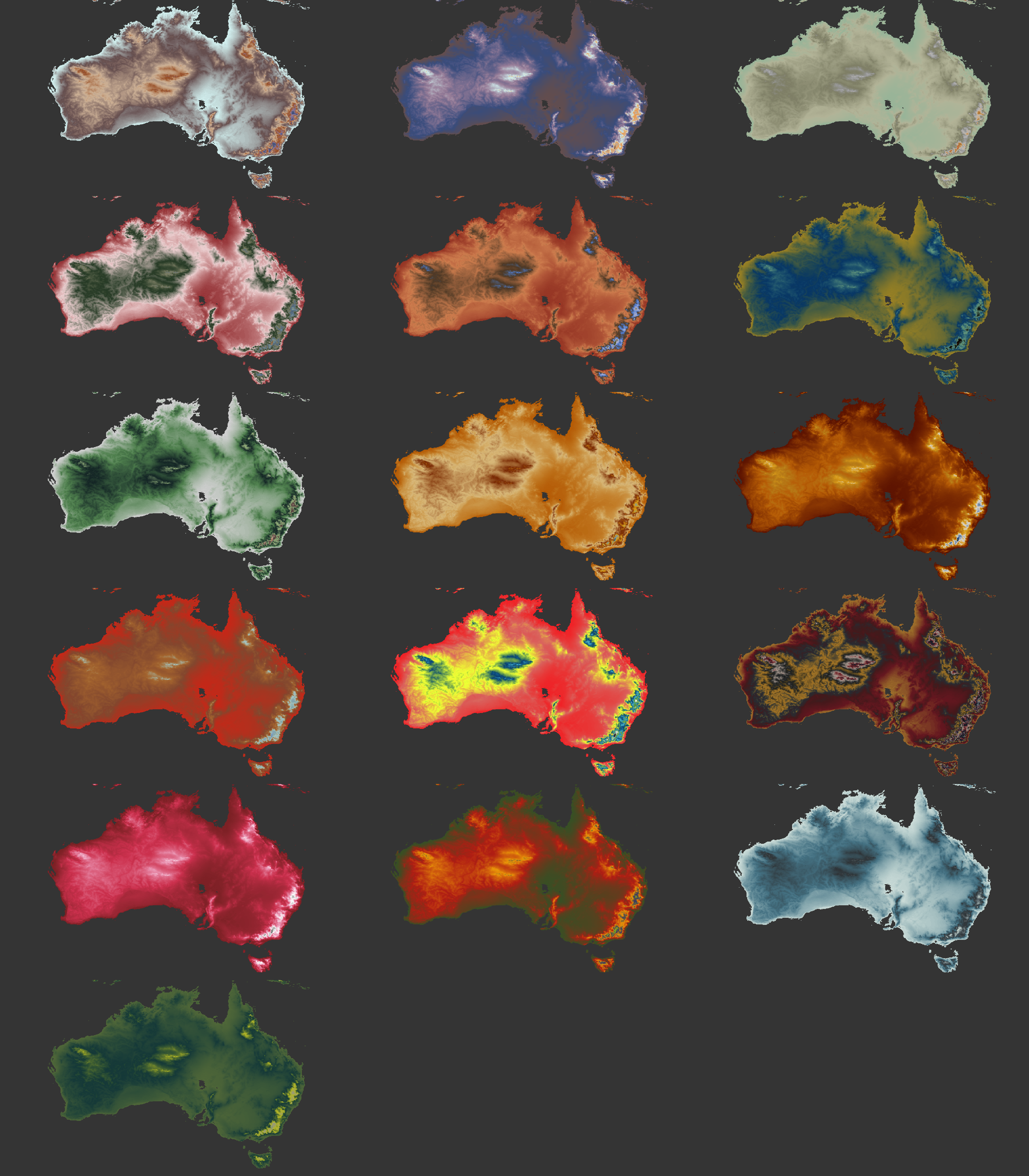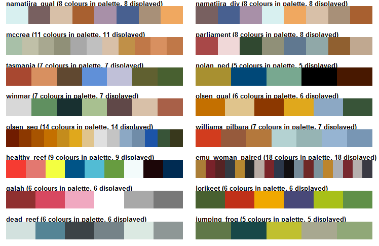 ochReOur package currently contains 16 colour palettes, each one inspired by either an Australian landscape, an artwork or image by an Australian artist, or an Australian animal. Some of the palettes are more suited to displaying continuous data (such as in the Australian elevation maps above). Other palettes will perform best plotting discrete data (as in the parliament example below).