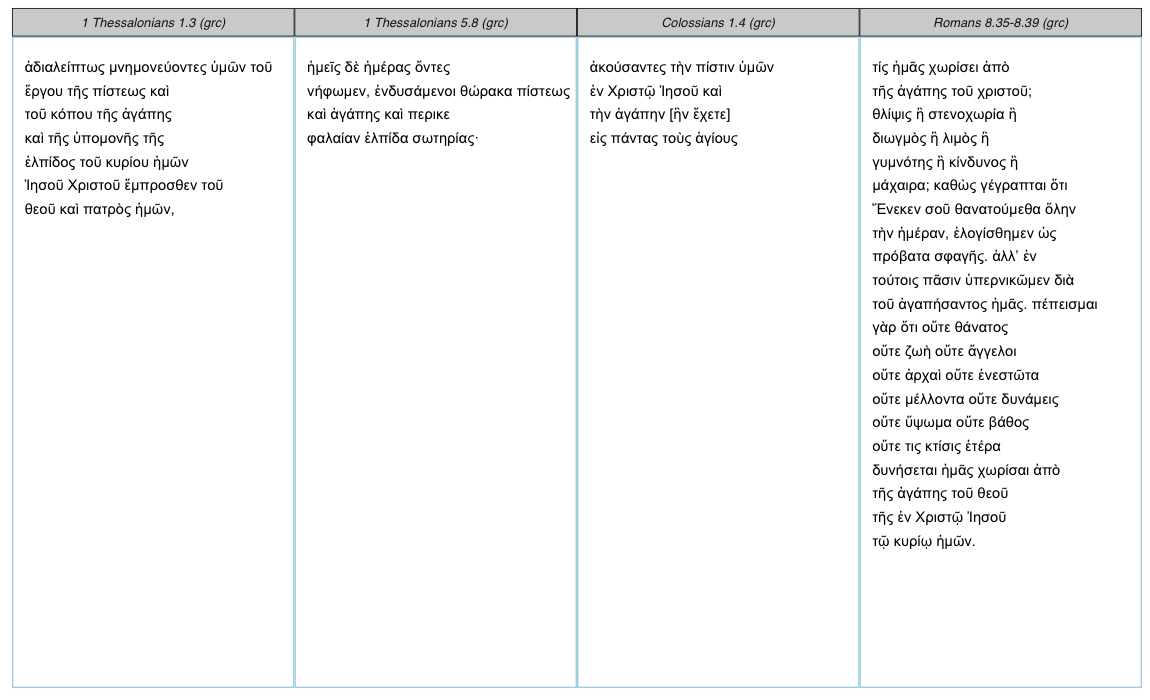 Suppose I am writing a paper on different expressions of love in Paul’s letters. Naturally, I start in 1 Corinthians 13, the famed “Love Chapter” often heard at weddings and seen on bumper stickers. I finish the chapter and turn to the margins. In the image below, I see references to Colossians 1:4, 1 Thessalonians 1:3, 5:8, Hebrews 10:22-24, and Romans 8:35-39.
