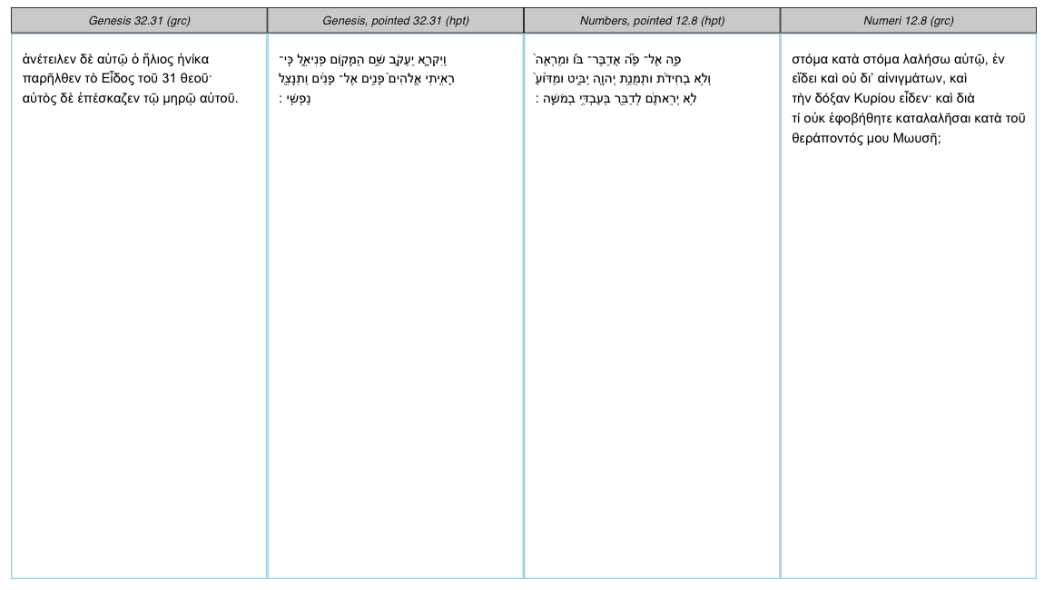 The English translation is from Rainbow Missions, Inc. World English Bible. Rainbow Missions, Inc.; revision of the American Standard Version of 1901. I’ve toyed with the idea of incorporating more modern translations, but that would require require resources beyond the Perseus Digital Library. ↩︎