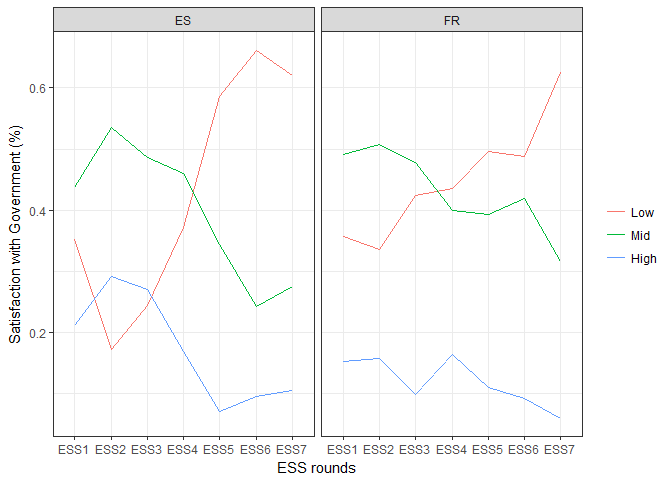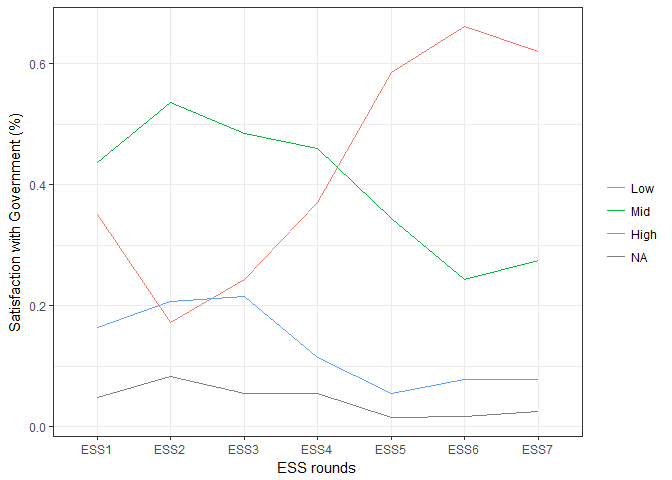 labs(x = "ESS rounds", y = "Satisfaction with Government (%)") +