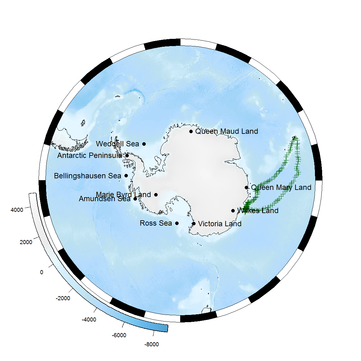 SCAR maintains a gazetteer of place names in the Antarctic and surrounding Southern Ocean2, which is available to R users via the antanym package: