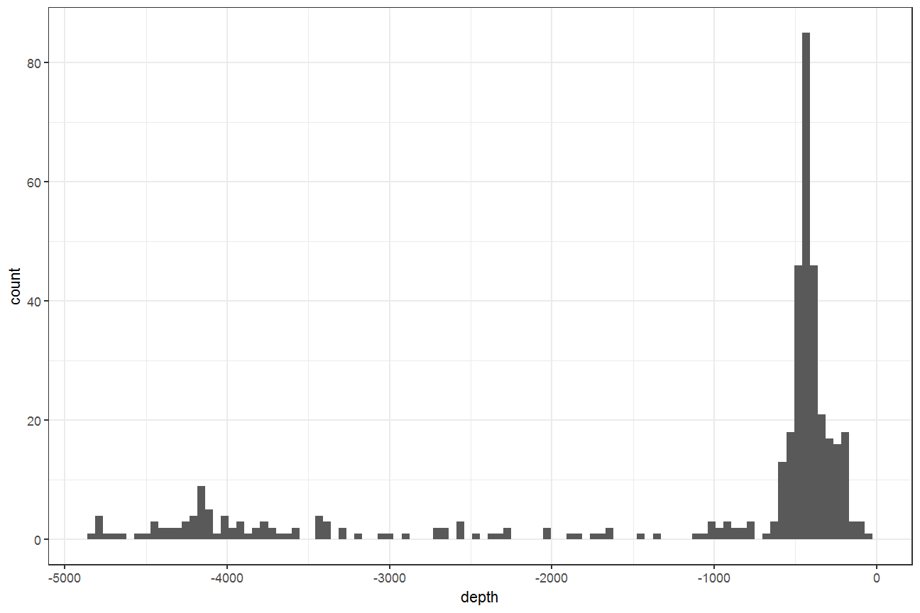 ggplot(ele, aes(depth)) + geom_histogram(bins = 100) + theme_bw()