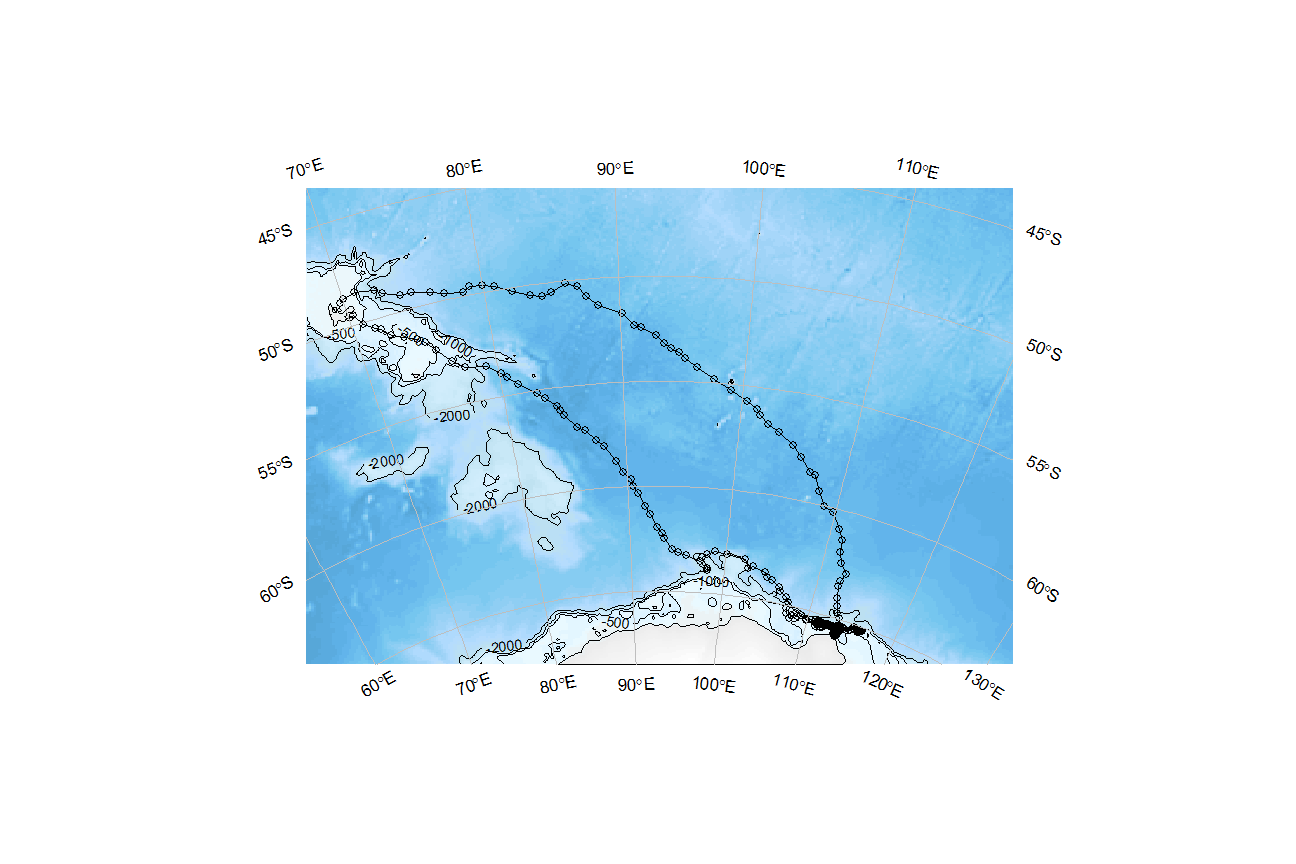 Let’s say that we have some points of interest in the Southern Ocean — perhaps a ship track, or some stations where we took marine samples, or as we’ll use here, the track of an elephant seal as it moves from the Kerguelen Islands to Antarctica and back again (Data from IMOS 20181, provided as part of the SOmap package).