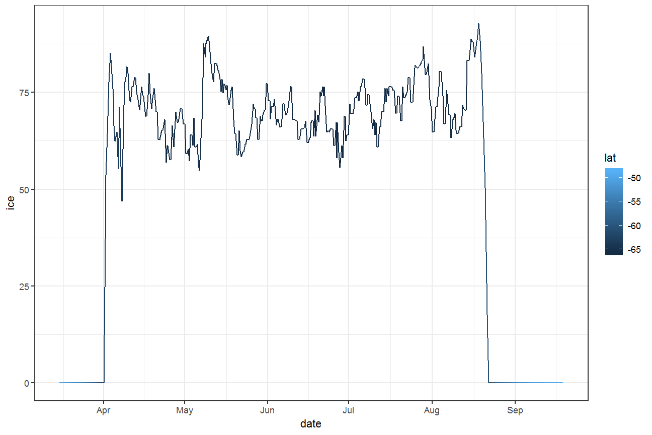 ggplot(ele, aes(date, ice, colour = lat)) + geom_path() + theme_bw()