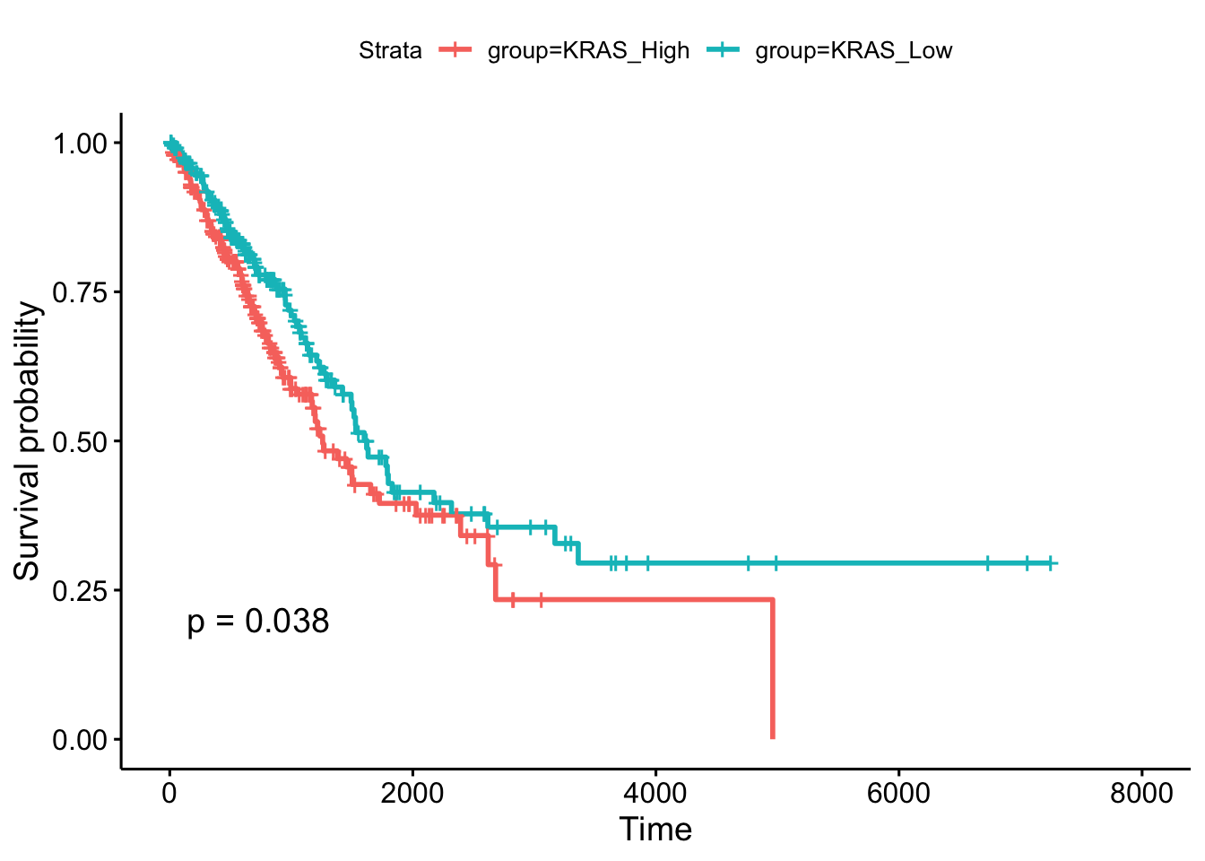 The Kaplan-Meier plot shows what percent of patients are alive at a time point. We can clearly see that patients in ‘KRAS_Low’ group have better survival than patients in ‘KRAS_High’ group because the survival probability of ‘KRAS_High’ group is always lower than ‘KRAS_Low’ group over time (the unit is ‘day’ here). The difference between the two groups is statistically significant (p<0.05 by log-rank test).